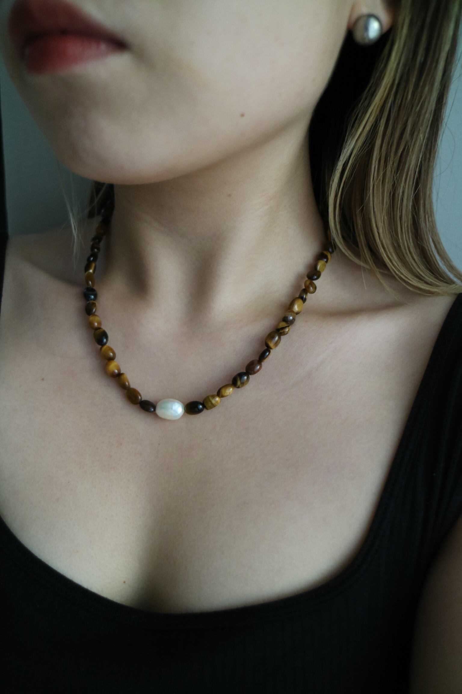 Natural stone & pearl mix Necklace【Aian Tiger Eye】